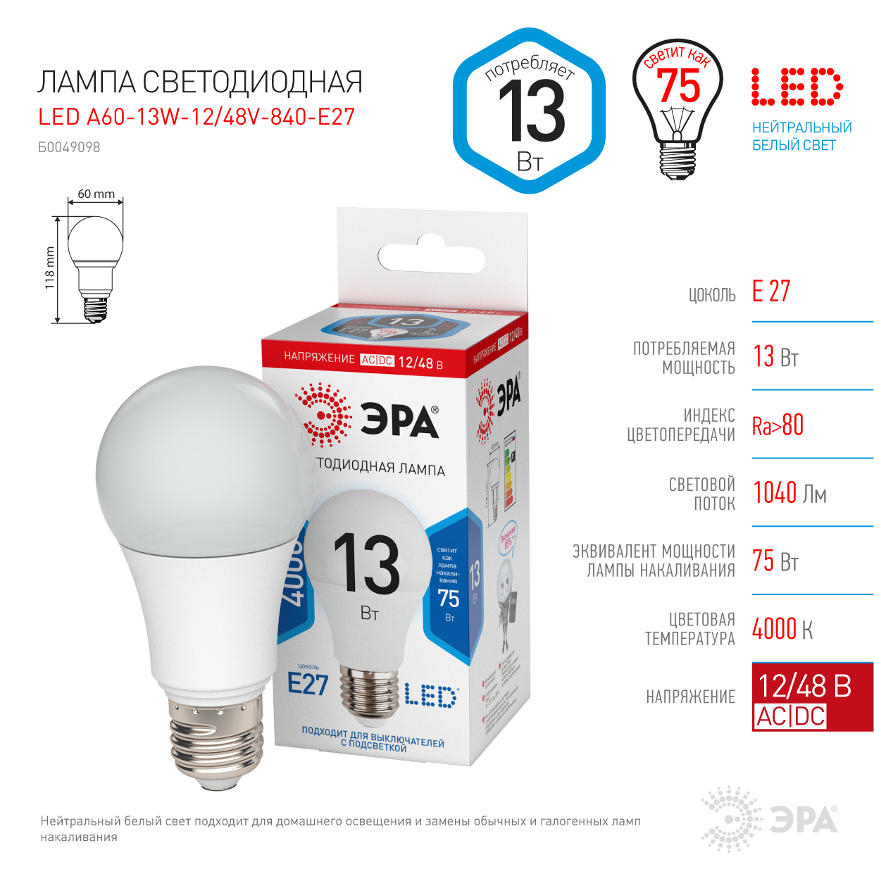 Лампочка светодиодная ЭРА STD LED A60-13W-12/48V-840-E27 E27 / Е27 13Вт груша нейтральный белый свет