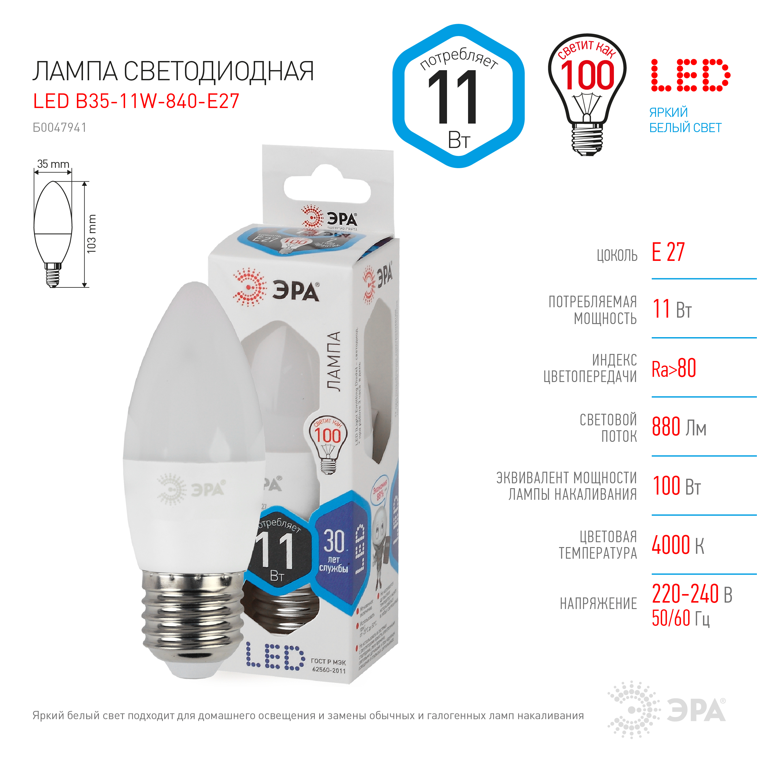 Лампочка светодиодная ЭРА STD LED A60-11W-127V-840-E27 E27 / Е27 11Вт груша нейтральный белый свет