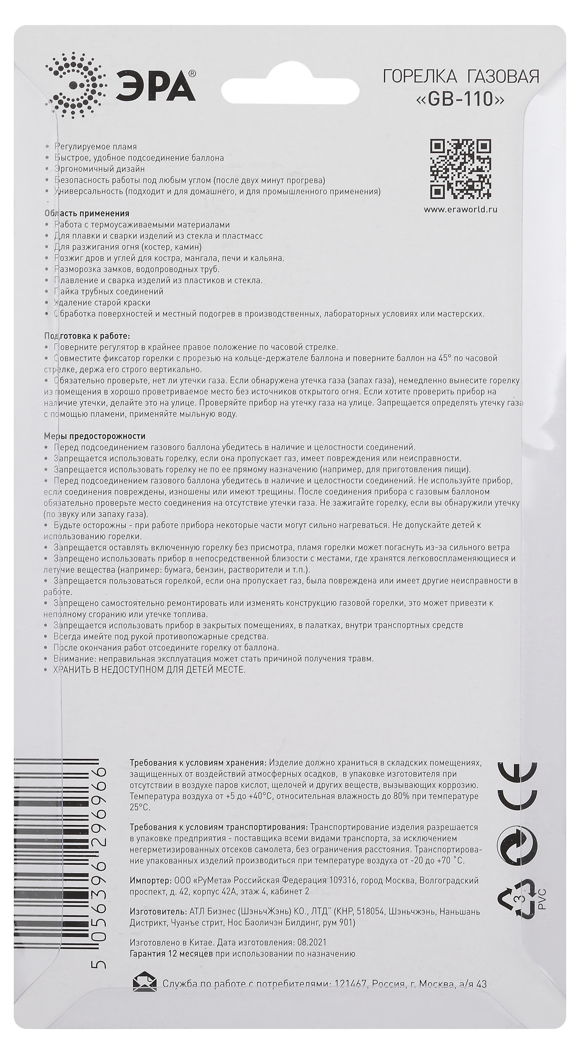 Горелка газовая ЭРА GB110 без пьезоподжига, диаметр сопла 10 мм установка на баллон