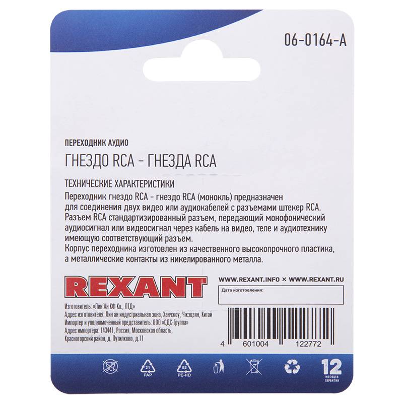 Переходник аудио (2 гнезда RCA - 2 гнезда RCA), бинокль, (1шт) REXANT