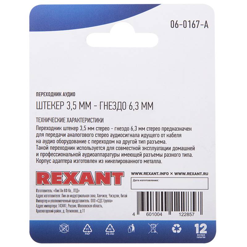 Переходник аудио (штекер 3,5 мм стерео - гнездо 6,3мм стерео), металл, (1шт) REXANT