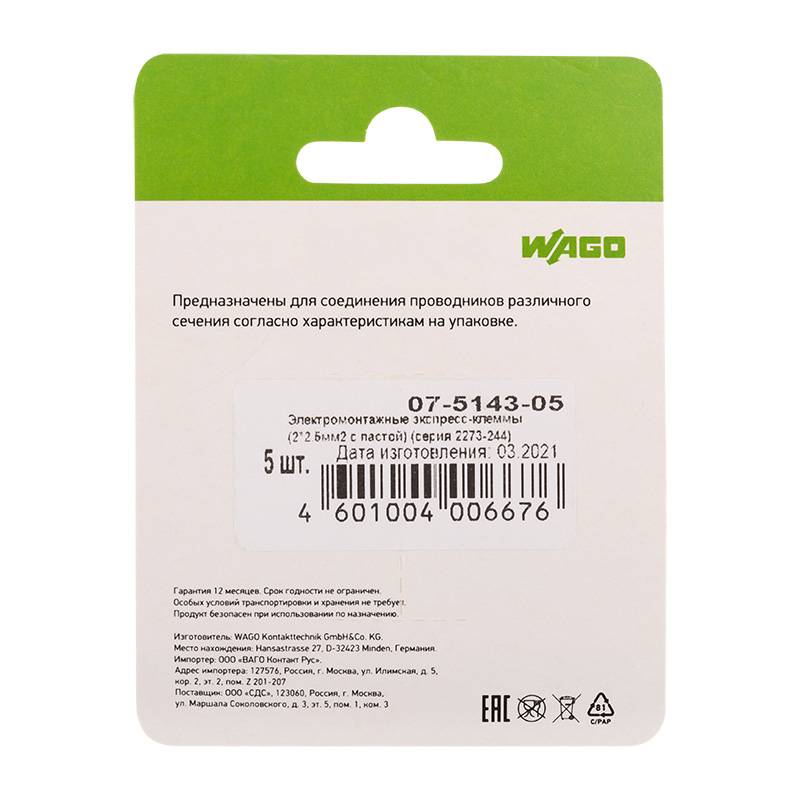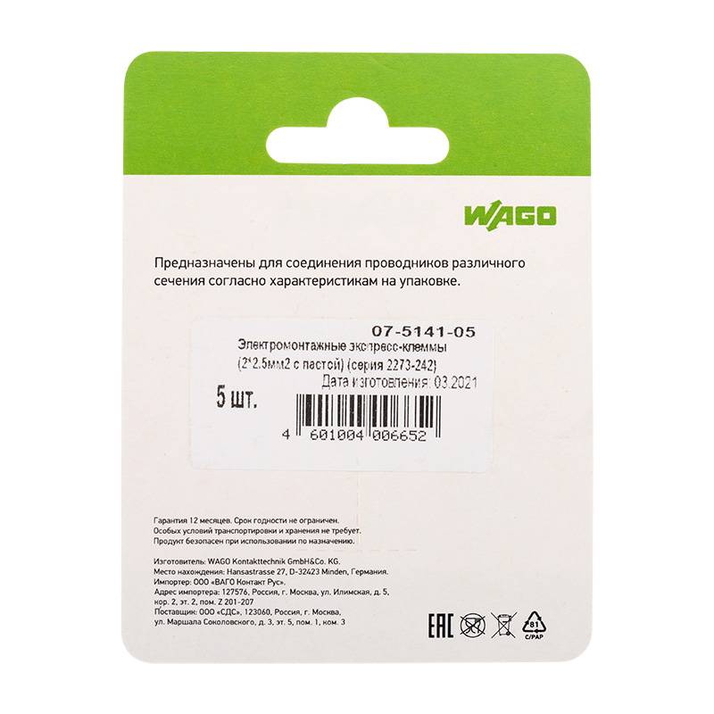 Электромонтажные экспресс-клеммы (2*2.5мм2 с пастой) 5шт WAGO