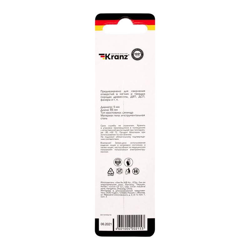 Сверло по дереву 5х85 мм, цилиндрический хвостовик Kranz
