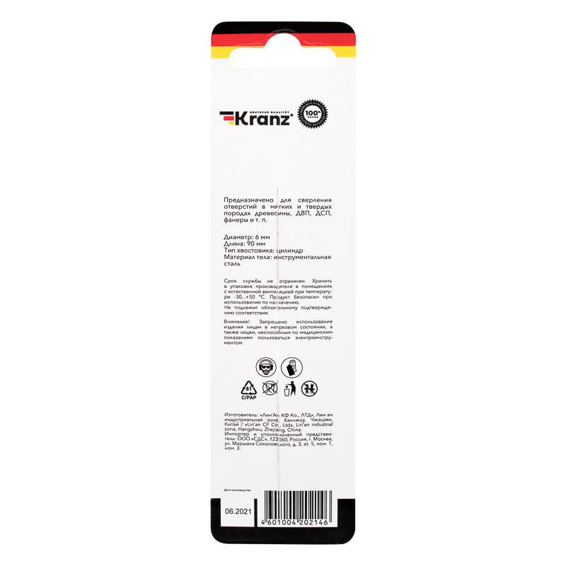 Сверло по дереву 6х90 мм, цилиндрический хвостовик Kranz