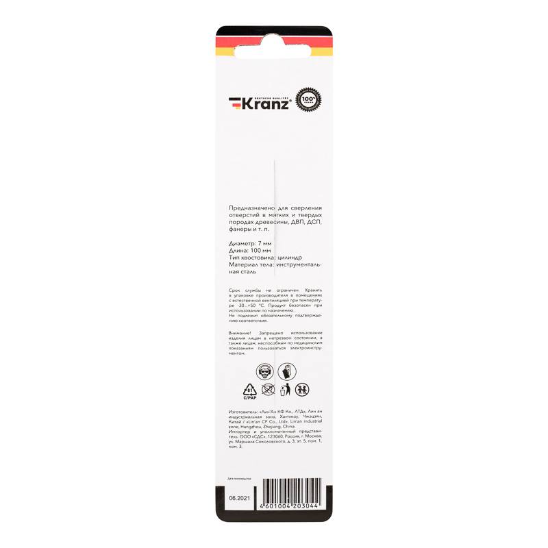 Сверло по дереву 7х105 мм, цилиндрический хвостовик Kranz