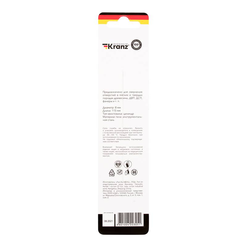 Сверло по дереву 8х115 мм, цилиндрический хвостовик Kranz