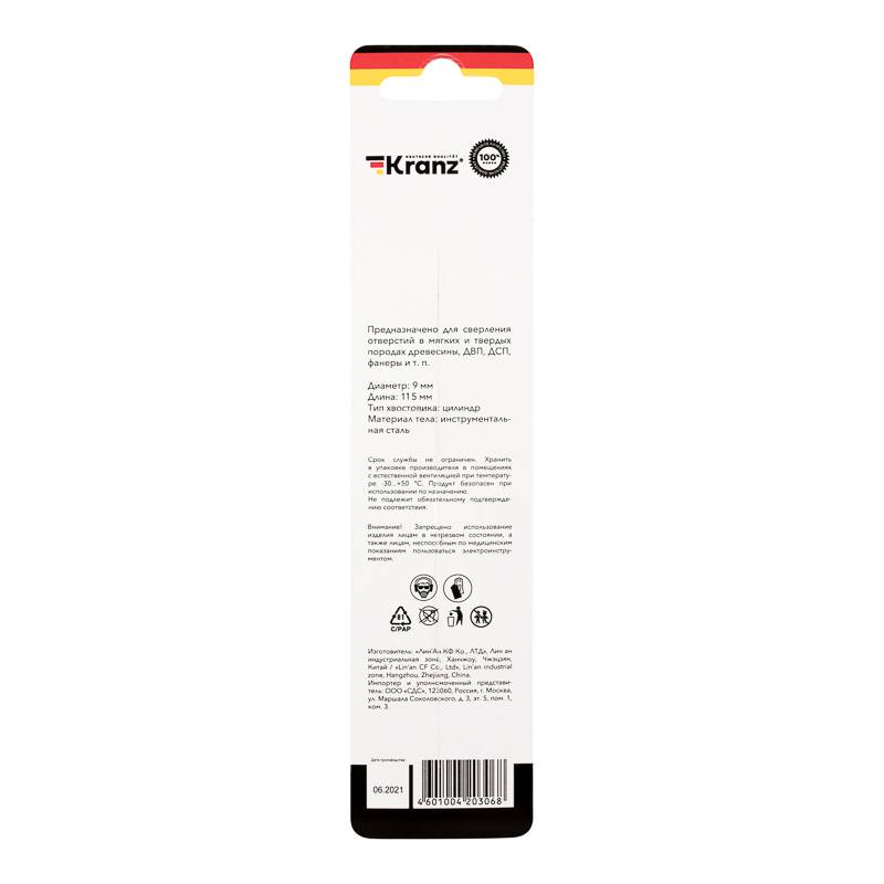 Сверло по дереву 9х125 мм, цилиндрический хвостовик Kranz