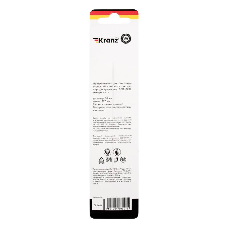 Сверло по дереву 10х130 мм, цилиндрический хвостовик Kranz