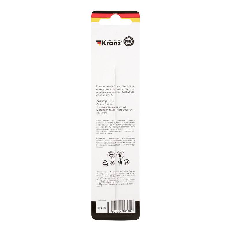 Сверло по дереву 12х150 мм, цилиндрический хвостовик Kranz