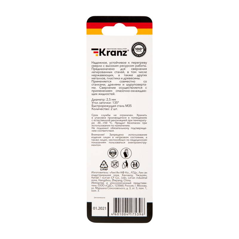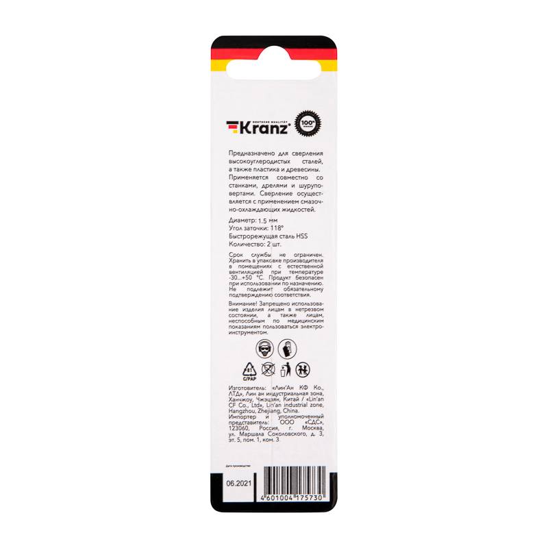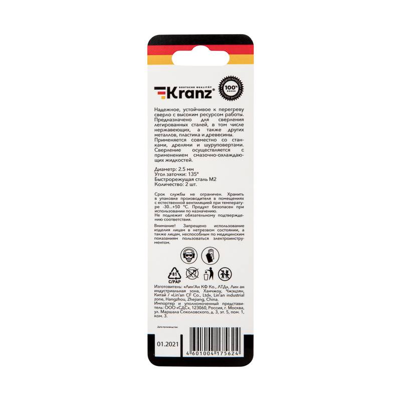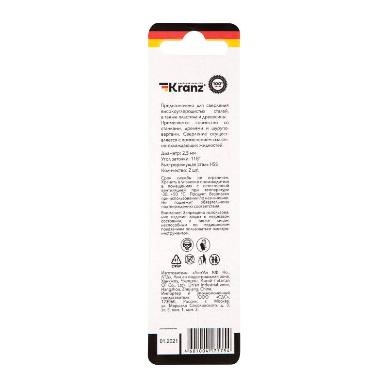 Сверло по металлу 2,5х57х30 мм HSS (2 шт. в упаковке) DIN 338 Kranz