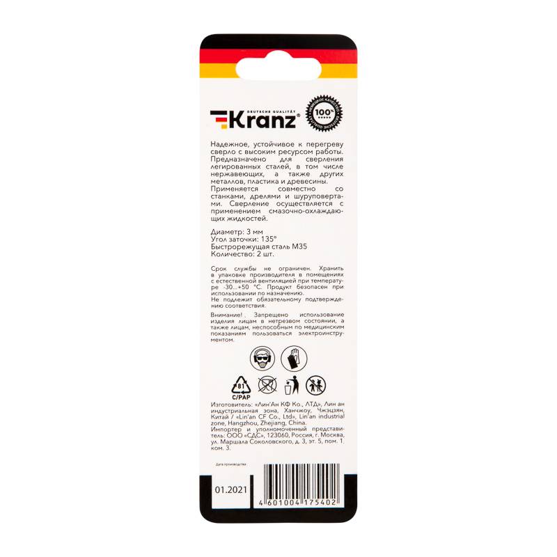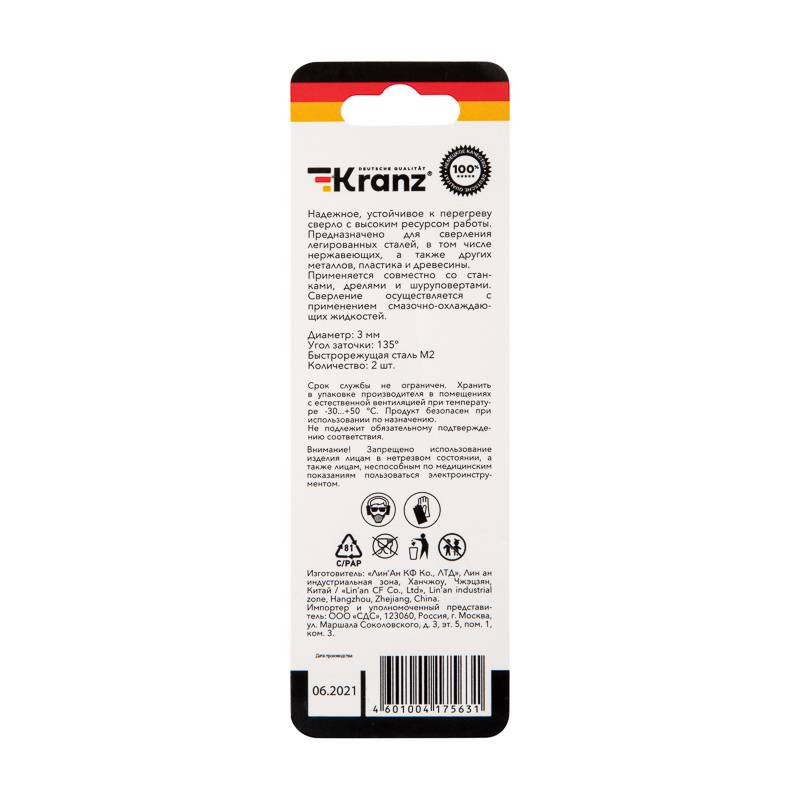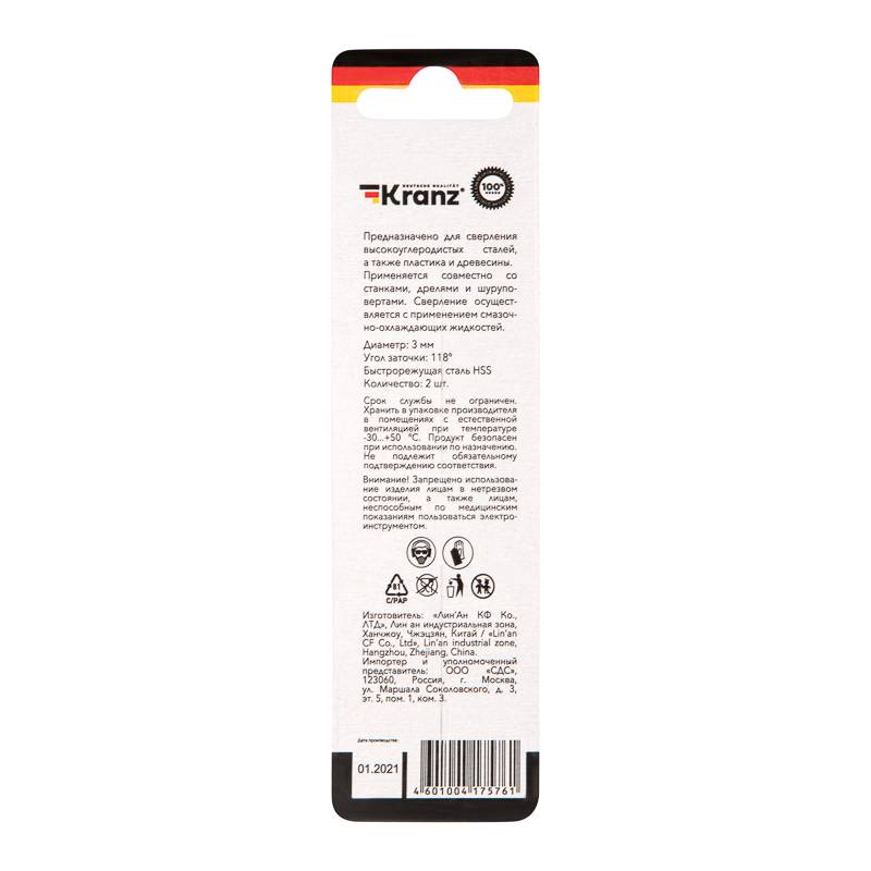Сверло по металлу 3,0х61х33 мм HSS (2 шт. в упаковке) DIN 338 Kranz