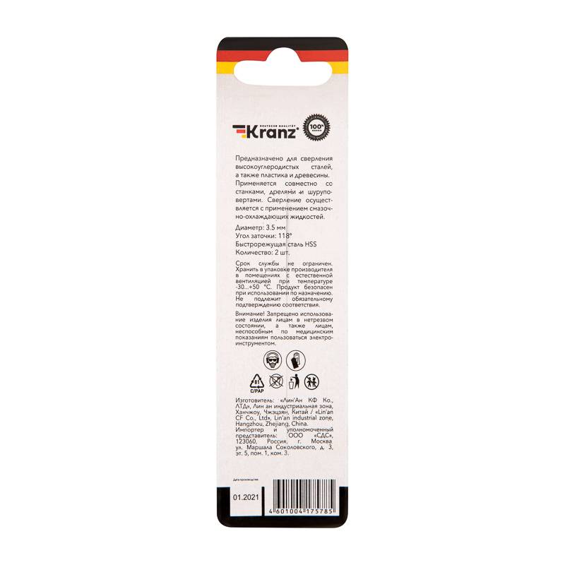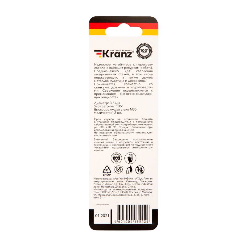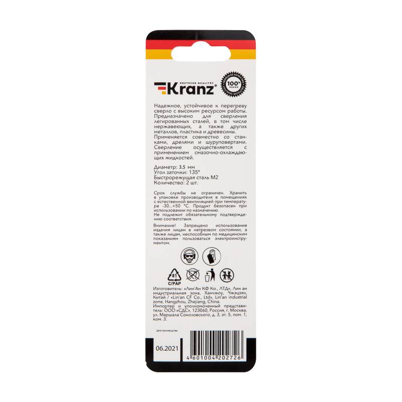 Сверло по металлу 3,5х70х39 мм HSS (2 шт. в упаковке) DIN 338 Kranz