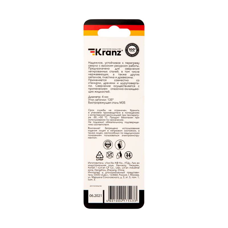 Сверло по металлу 4х75х43 мм «Кобальт» (сталь HSS-Co 5% M35 P6M5K5) (1 шт. в блистере) DIN 338 Kranz