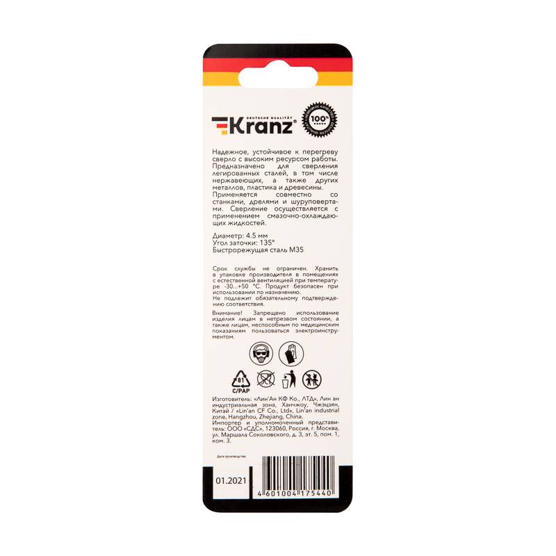 Сверло по металлу 4,5х80х47 мм «Кобальт» (сталь HSS-Co 5% M35 P6M5K5) (1 шт. в блистере) DIN 338 Kranz