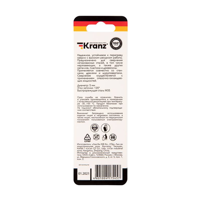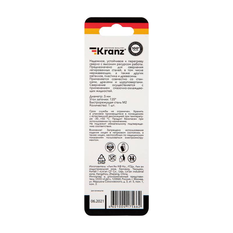 Сверло по металлу 5,0х86х52 мм HSS (1 шт. в упаковке) DIN 338 Kranz