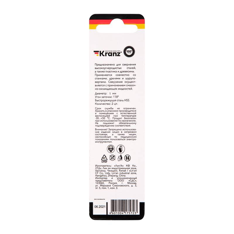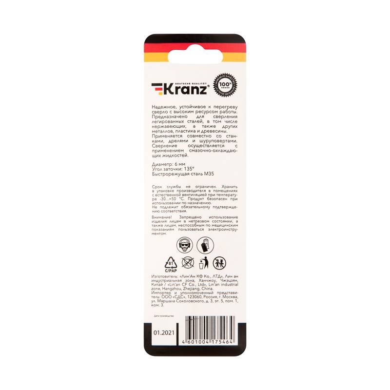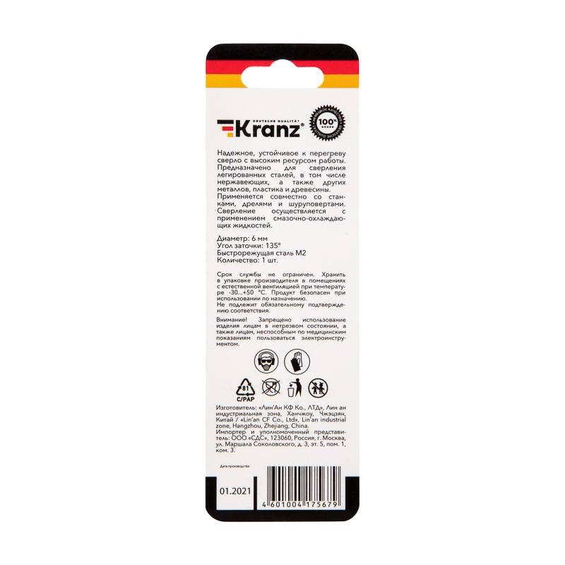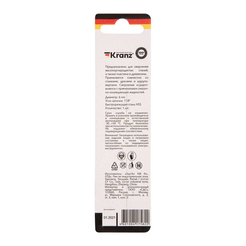 Сверло по металлу 6,0х93х57 мм HSS (1 шт. в упаковке) DIN 338 Kranz
