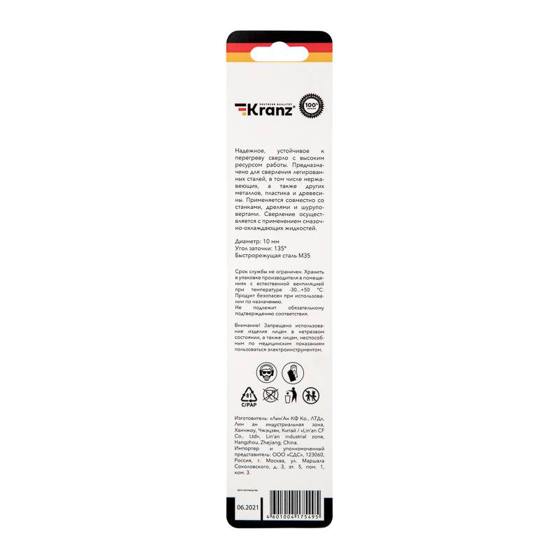 Сверло по металлу 10х133х87 мм «Кобальт» (сталь HSS-Co 5% M35 P6M5K5) (1 шт. в блистере) DIN 338 Kranz