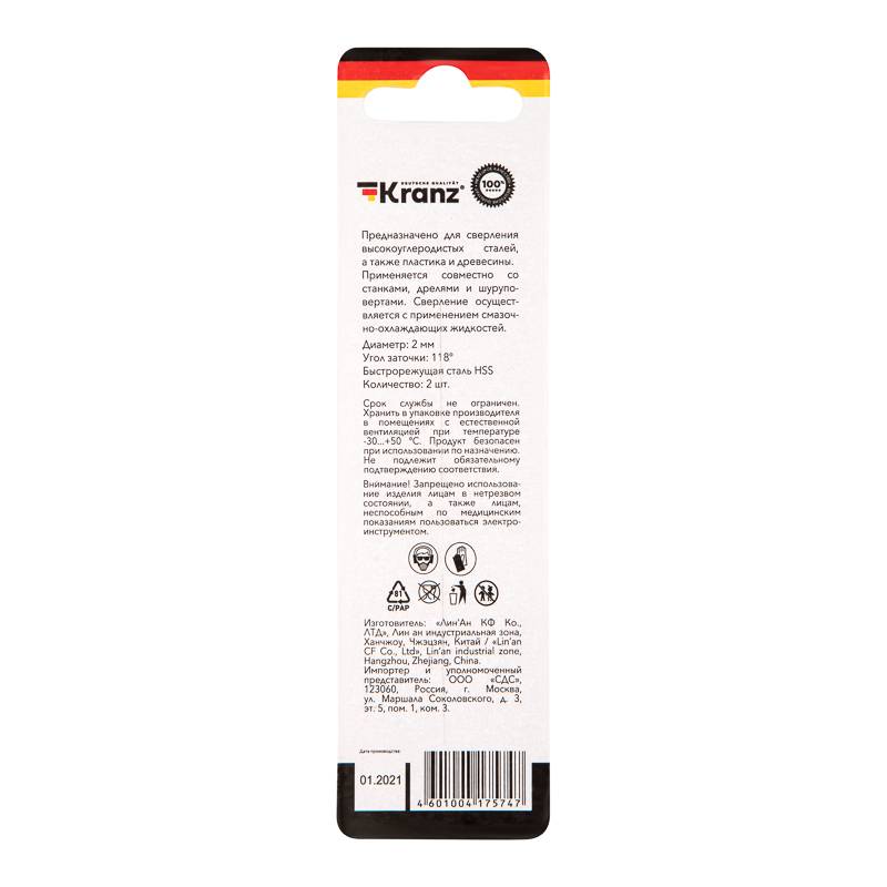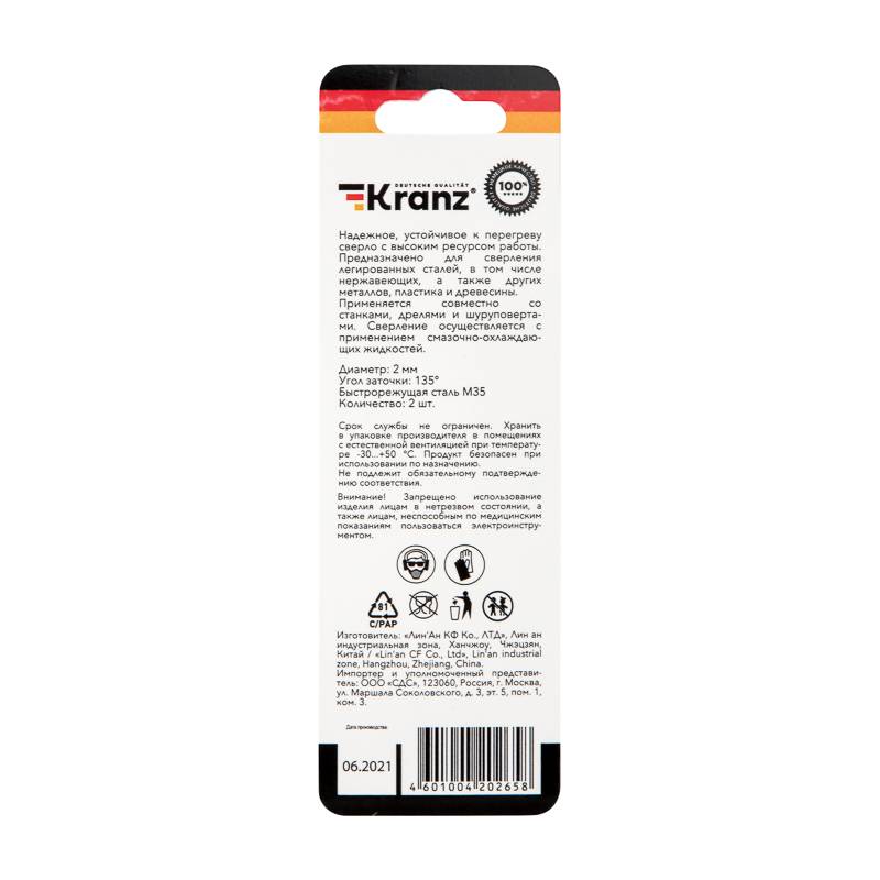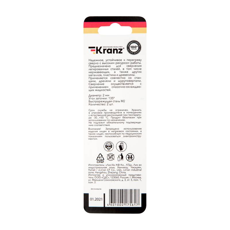 Сверло по металлу 2х49х24 мм «Стандарт+» (P6M5 M-2) (2 шт. в блистере) DIN 338 Kranz