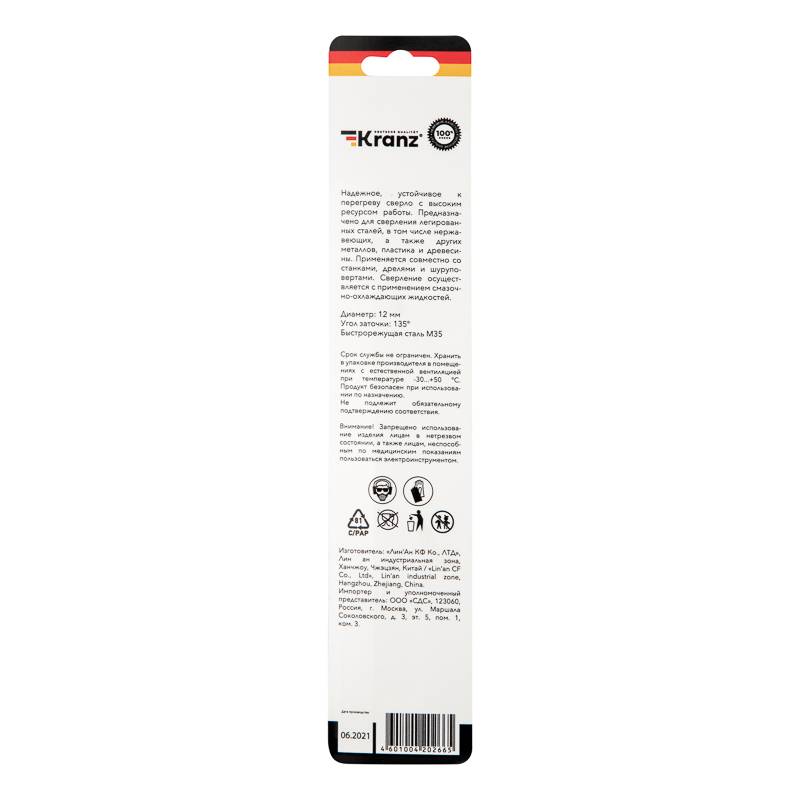 Сверло по металлу 12х151х101 мм «Кобальт» (сталь HSS-Co 5 % M35 P6M5K5) (1 шт. в блистере) DIN 338 KRANZ