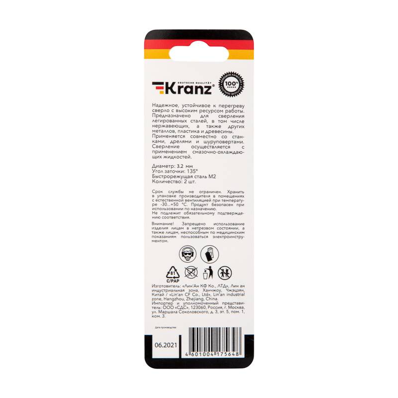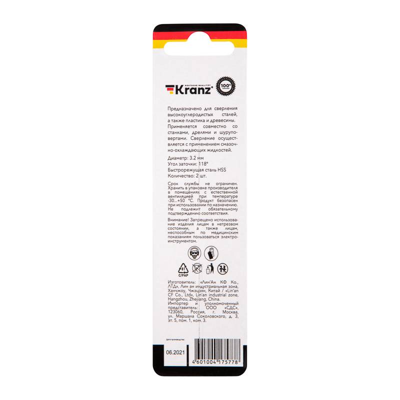Сверло по металлу 3,2х65х35 мм HSS (2 шт. в упаковке) DIN 338 Kranz
