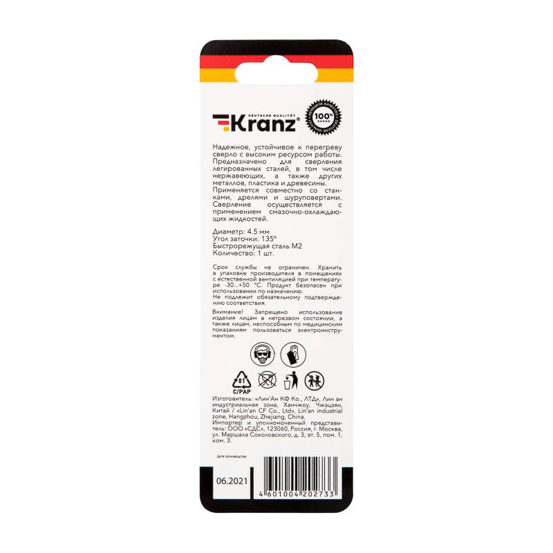 Сверло по металлу 4,5х80х47 мм «Стандарт+» (P6M5 M-2) (1 шт. в блистере) DIN 338 Kranz