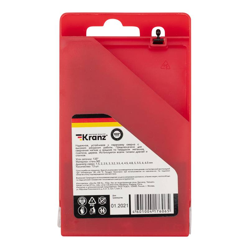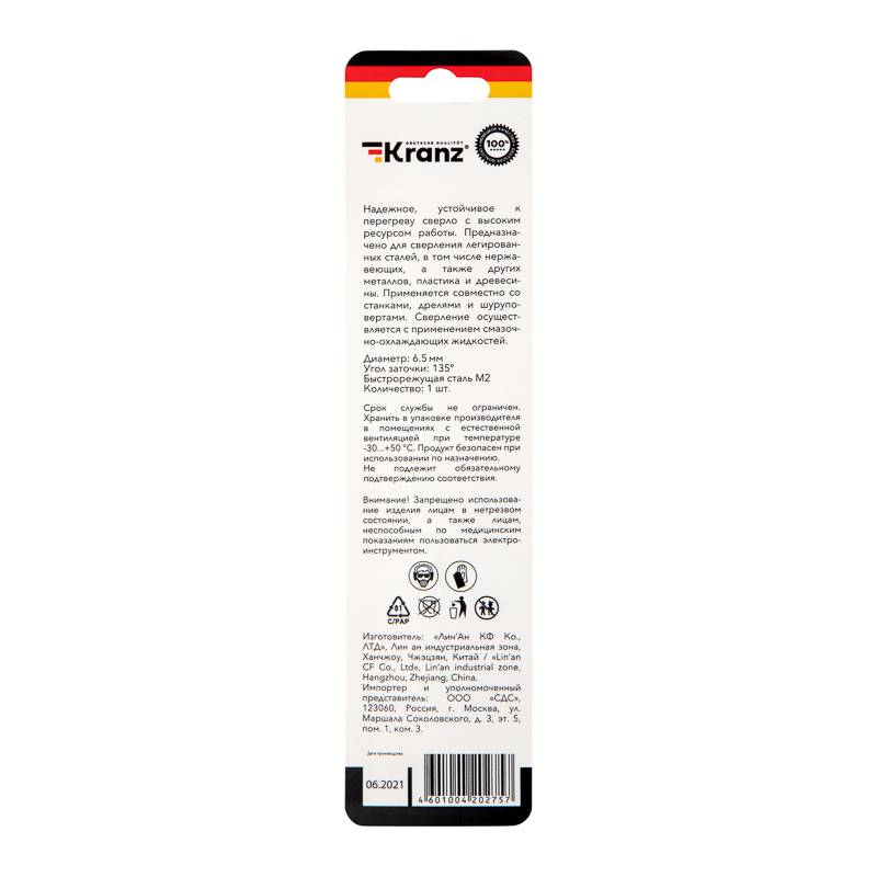 Сверло по металлу 6,5х101х63 мм «Стандарт+» (P6M5 M-2) (1 шт. в блистере) DIN 338 Kranz