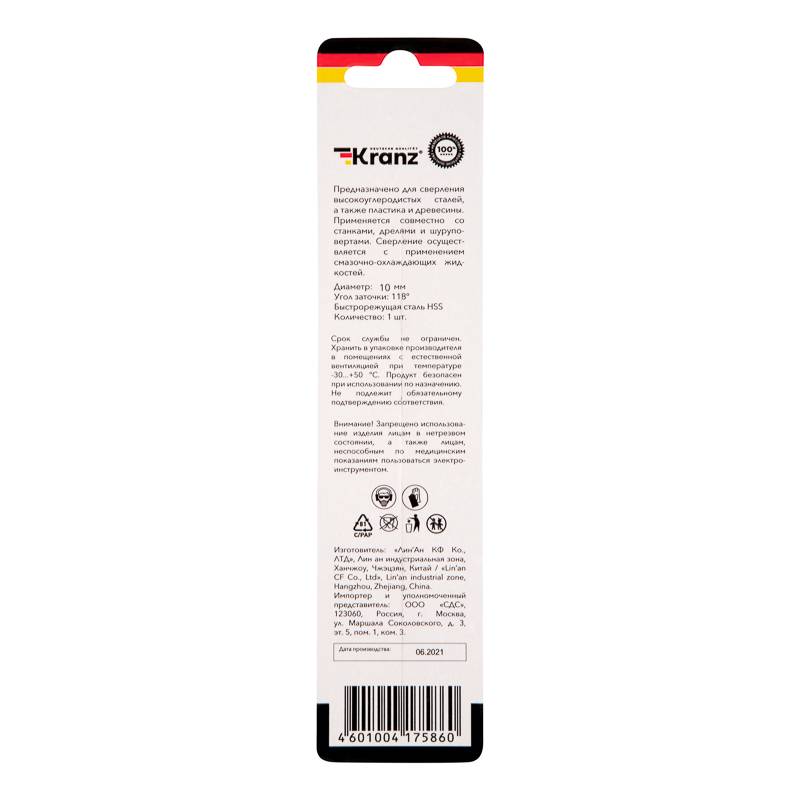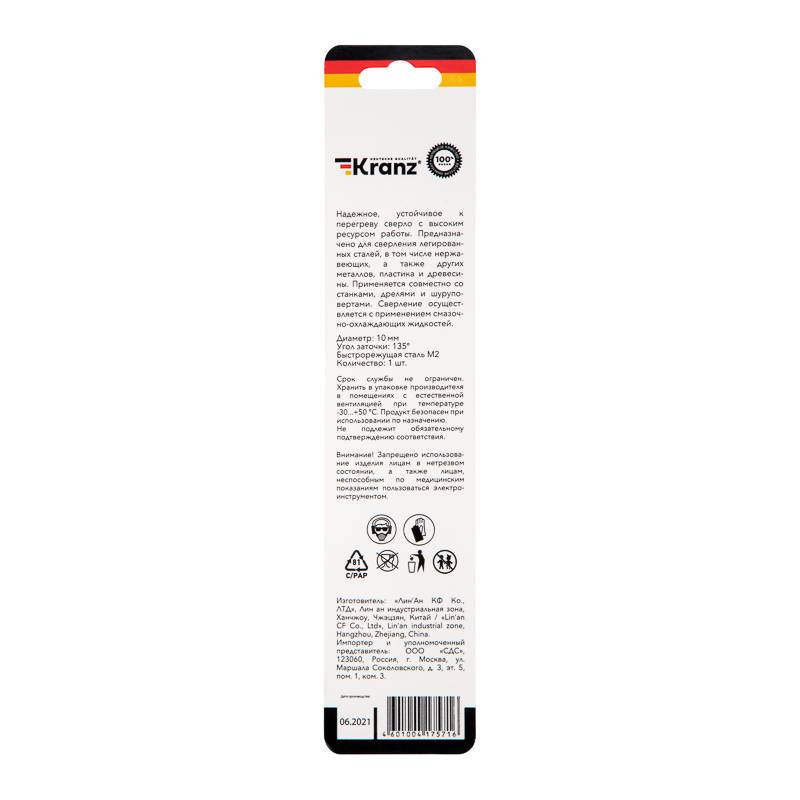 Сверло по металлу 10х133х87 мм «Стандарт+» (P6M5 M-2) (1 шт. в блистере) DIN 338 Kranz
