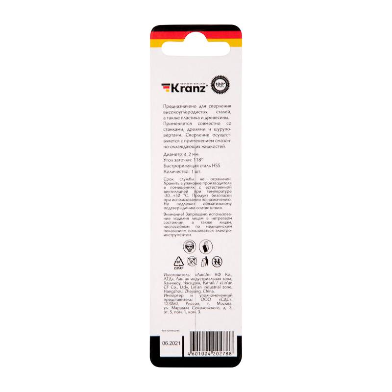 Сверло по металлу 4,2х75х43 мм HSS (1 шт. в упаковке) DIN 338 KRANZ