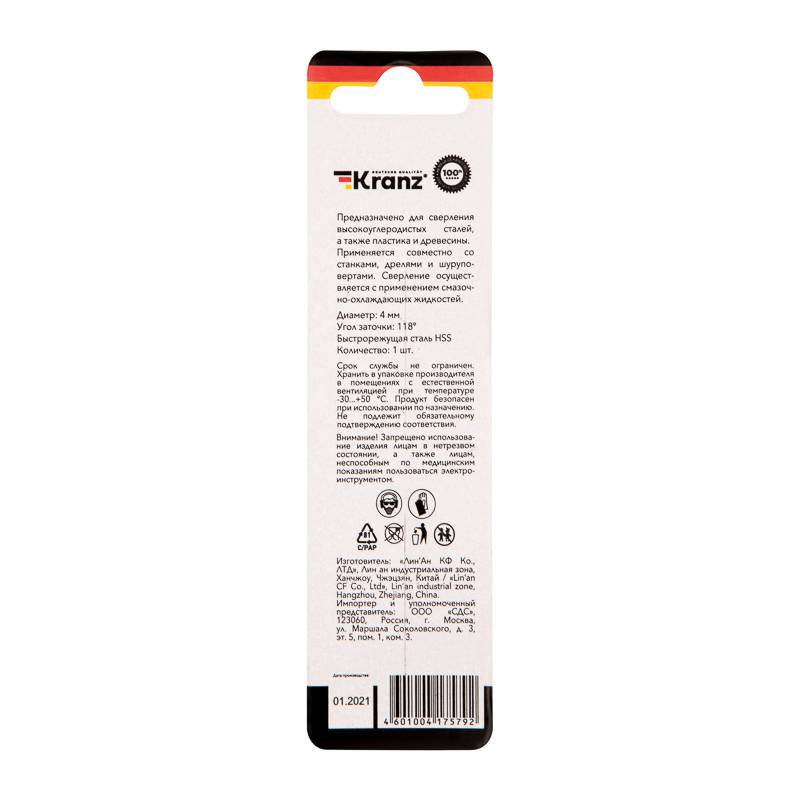 Сверло по металлу 4,0х75х43 мм HSS (1 шт. в упаковке) DIN 338 Kranz
