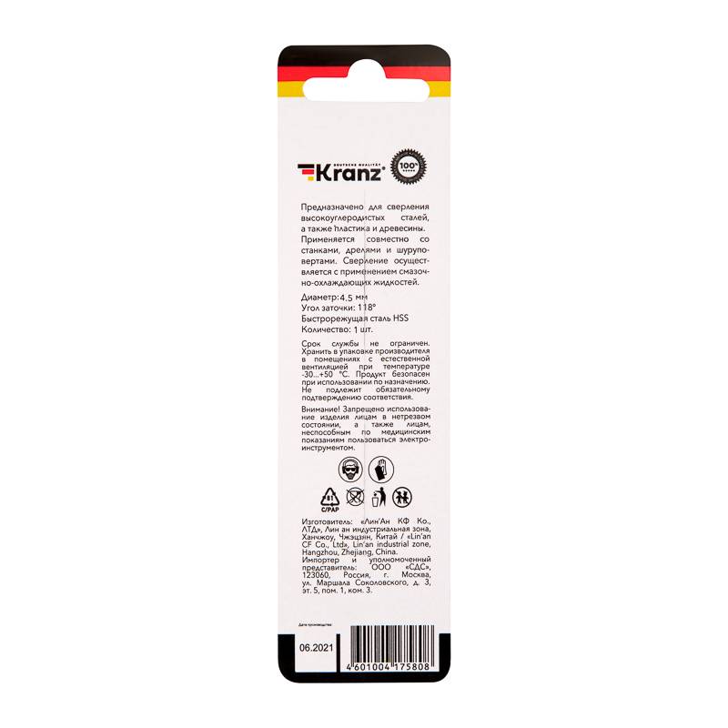 Сверло по металлу 4,5х80х47 мм HSS (1 шт. в упаковке) DIN 338 Kranz