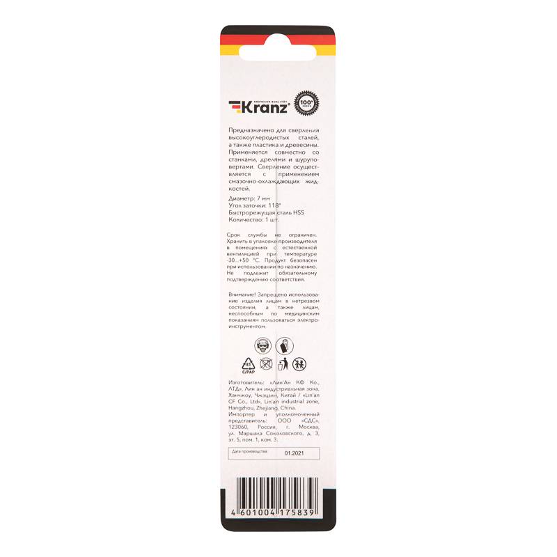 Сверло по металлу 7,0х109х69 мм HSS (1 шт. в упаковке) DIN 338 Kranz