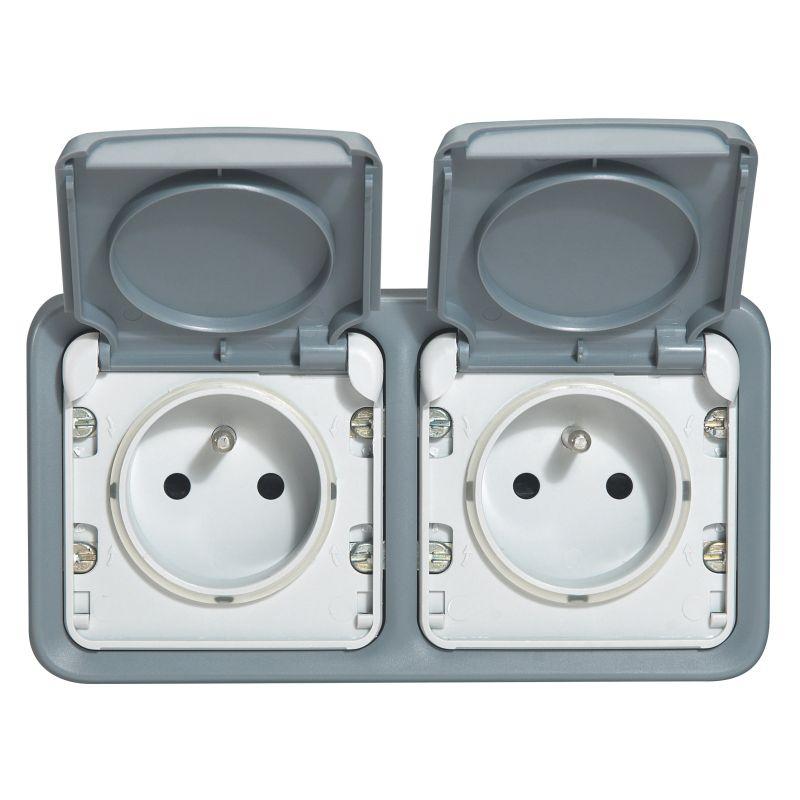 Розетка 2-м СП Plexo 16А IP55 горизонт. 2х2P+E с заземл. с крышкой немецк. стандарт механизм сер. Leg 069576