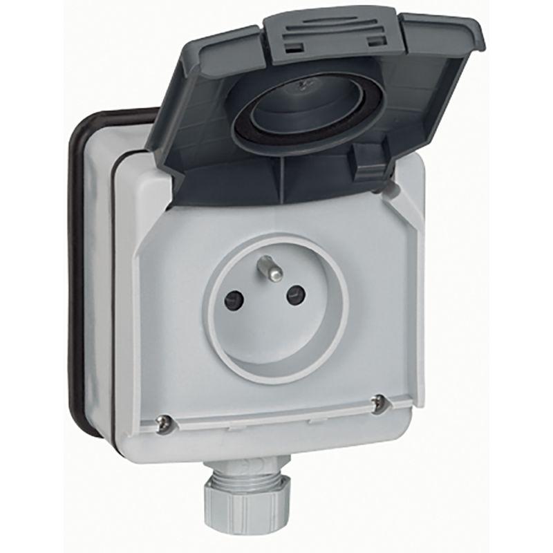 Розетка 1-м ОП Plexo 16А IP55 2P+E с крышкой немецк. стандарт винт. клеммы сер. Leg 069733