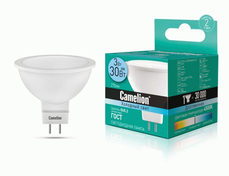 Лампа светодиодная LED3-JCDR/845/GU5.3 3Вт 4500К бел. GU5.3 235лм 220-240В Camelion 11368