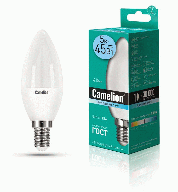 Лампа светодиодная LED5-C35/845/E14 5Вт свеча 4500К бел. E14 405лм 220-240В Camelion 12032