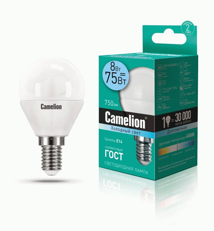 Лампа светодиодная LED8-G45/845/E14 8Вт шар 4500К бел. E14 750лм 170-265В Camelion 12393