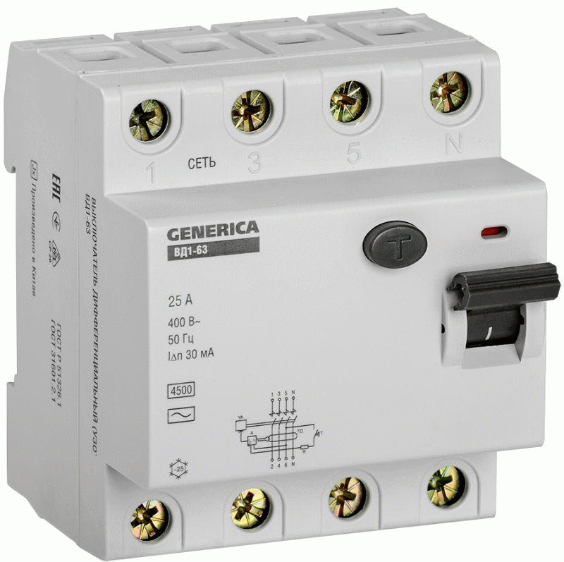 Выключатель дифференциального тока (УЗО) 4п 25А 30мА тип AC ВД1-63 GENERICA IEK MDV15-4-025-030