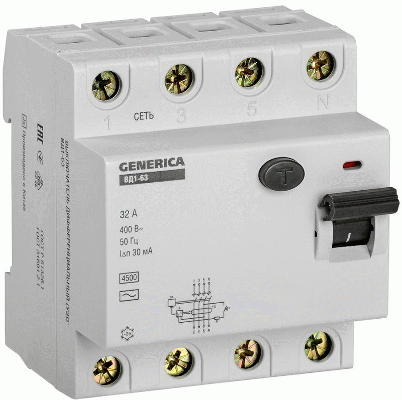 Выключатель дифференциального тока (УЗО) 4п 32А 30мА тип AC ВД1-63 GENERICA IEK MDV15-4-032-030